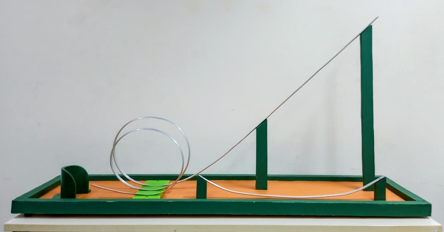 Neste experimento uma bola é largada num trilho a uma certa altura, ℎ. Na primeira parte, o trilho é reto e inclinado fazendo com que a bola desça sobre ele com aceleração constante. Na segunda parte, o trilho tem a forma de uma hélice cujo passo é pequeno o suficiente para que a hélice possa ser aproximada por uma circunferência de raio r, contida num plano vertical, onde ℎ = 0 corresponde ao ponto inferior da circunferência (a base do “loop”). Repetindo o experimento várias vezes, para diferentes alturas, nota-se que só a partir de uma certa altura, ℎ ≥ 𝐻, a bola se move por todo o trilho sem perder o contato com ele, mesmo quando está debaixo do trilho, “de ponta-cabeça” no topo do “loop” (trecho circular).